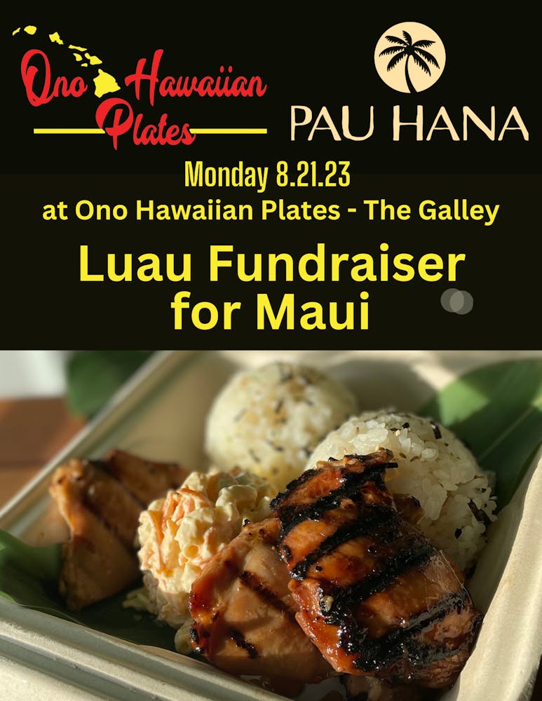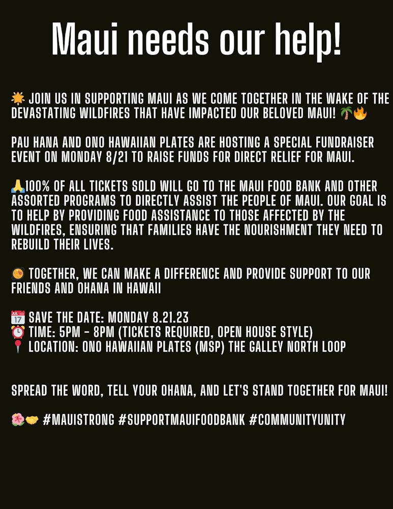 Join Pau Hana and Ono Hawaiian Plates as we collaborate for a special evening to help raise money for Maui in the wake of the devastating wildfires that have impacted our ohana.